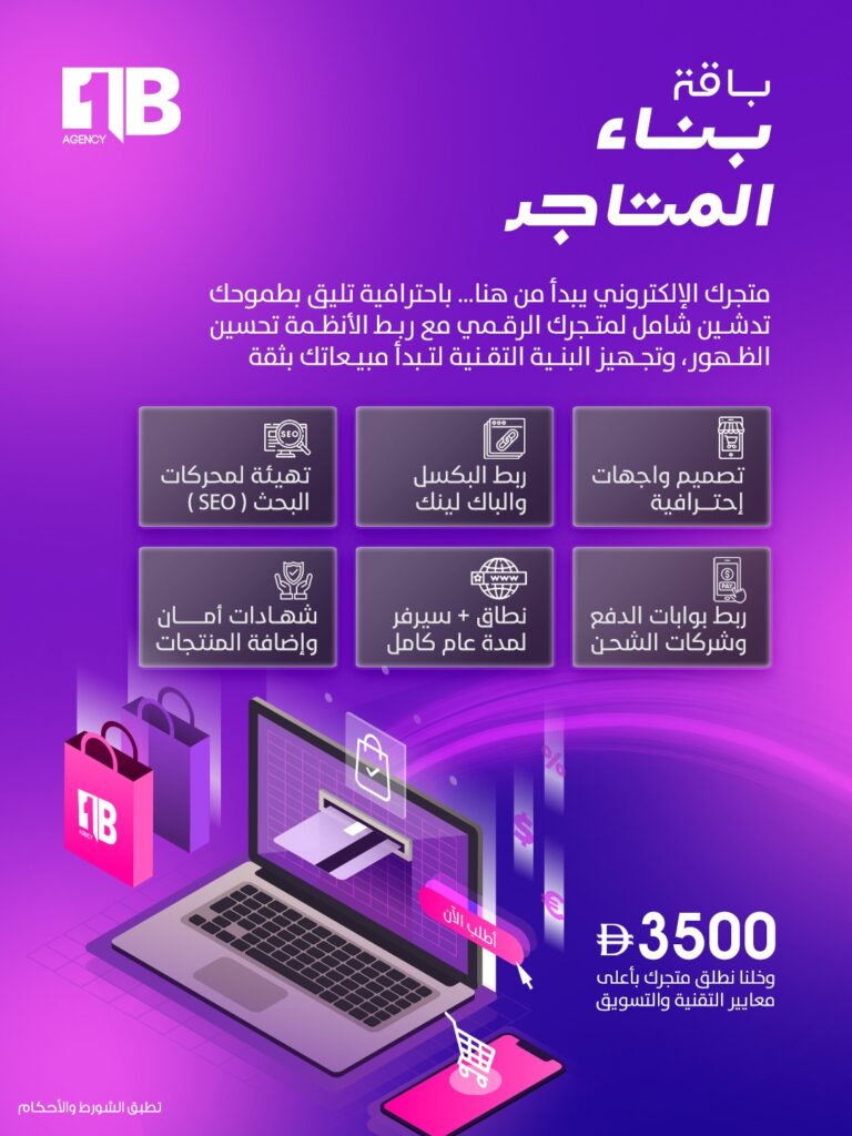 متجرك الإلكتروني يبدأ من هنا… باحترافية تليق بطموحك بناء شامل لمتجرك الرقمي مع ربط الأنظمة تحسين الظهور، وتجهيز البنية التقنية لتبدأ مبيعاتك بثقة